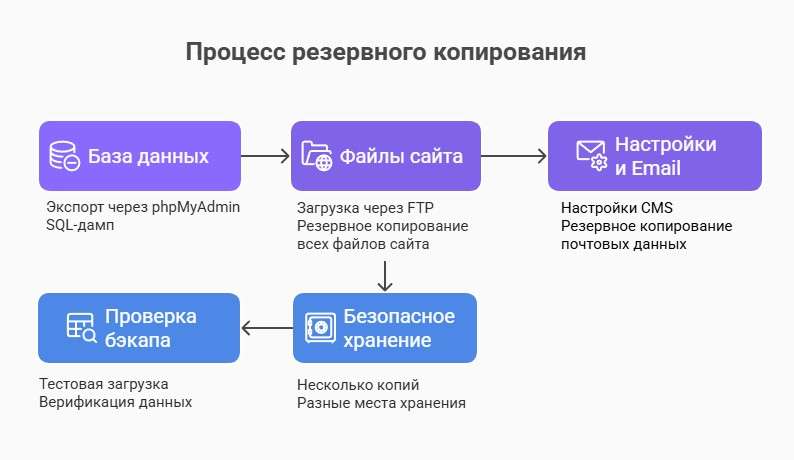 Резервное копирование — неотъемлемая часть подготовки. Это страховка на случай, если что-то пойдёт не так: бэкап позволяет восстановить сайт в прежнем состоянии. Это включает: